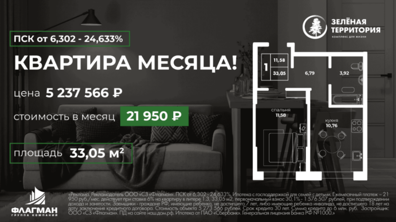 «Реклама. Рекламодатель ООО «СЗ «Флагман». ПСК от 6,302 - 24,633%. Ипотека с господдержкой для семей с детьми. Ежемесячный платеж – 21 950 руб./мес. действует при ставке 6% на квартиру в литере 1.3, 33,05 м2, первоначальный взнос 30,1% - 1 576 507 рублей, при подтверждении дохода и занятости. Заемщики - граждане РФ, имеющие ребенка, не достигшего 7 лет, либо имеющие ребенка инвалида, не достигшего 18 лет на дату заключения кредитного договора. Стоимость объекта 5 273 566 рублей. Срок кредита 30 лет. Сумма кредита до 6 млн. руб. Застройщик: ООО «СЗ «Флагман». ПД на сайте наш.дом.рф. Ипотека от ПАО «Сбербанк». Генеральная лицензия Банка РФ №1000.»